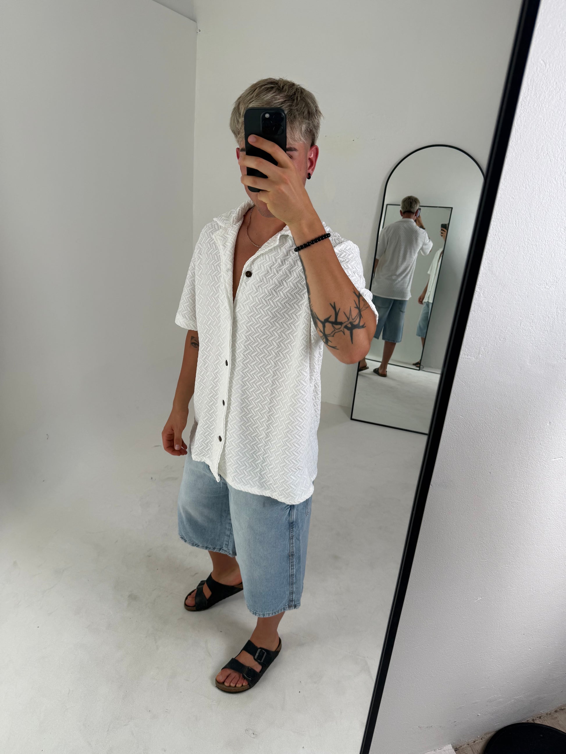 Minimalismo, frescura y sofisticación se unen en esta camisa tejida de manga corta, diseñada para ofrecer un estilo elegante y contemporáneo. Confeccionada en un tejido ligero con textura geométrica sutil, esta prenda destaca por su acabado refinado y su tacto suave, ideal para climas cálidos y looks pulidos sin esfuerzo.