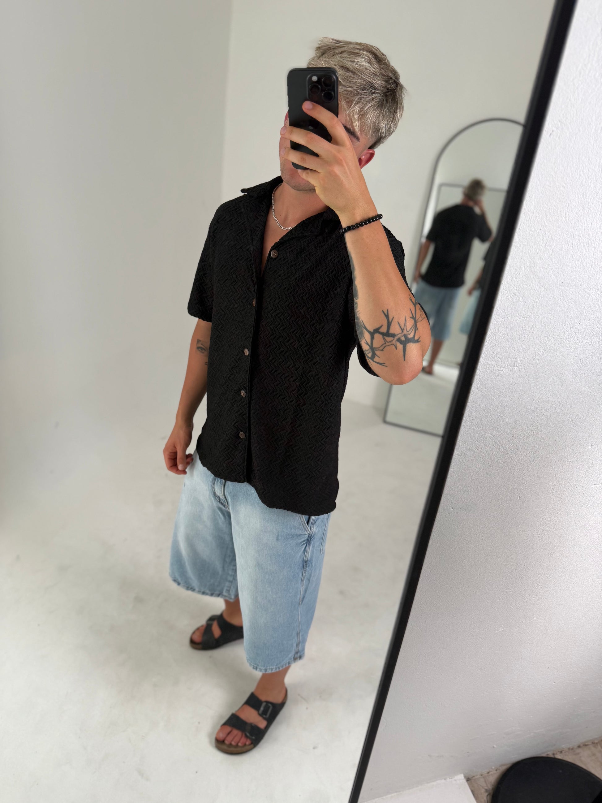 Camisa Tejida Texturizada de Manga Corta – Negro
