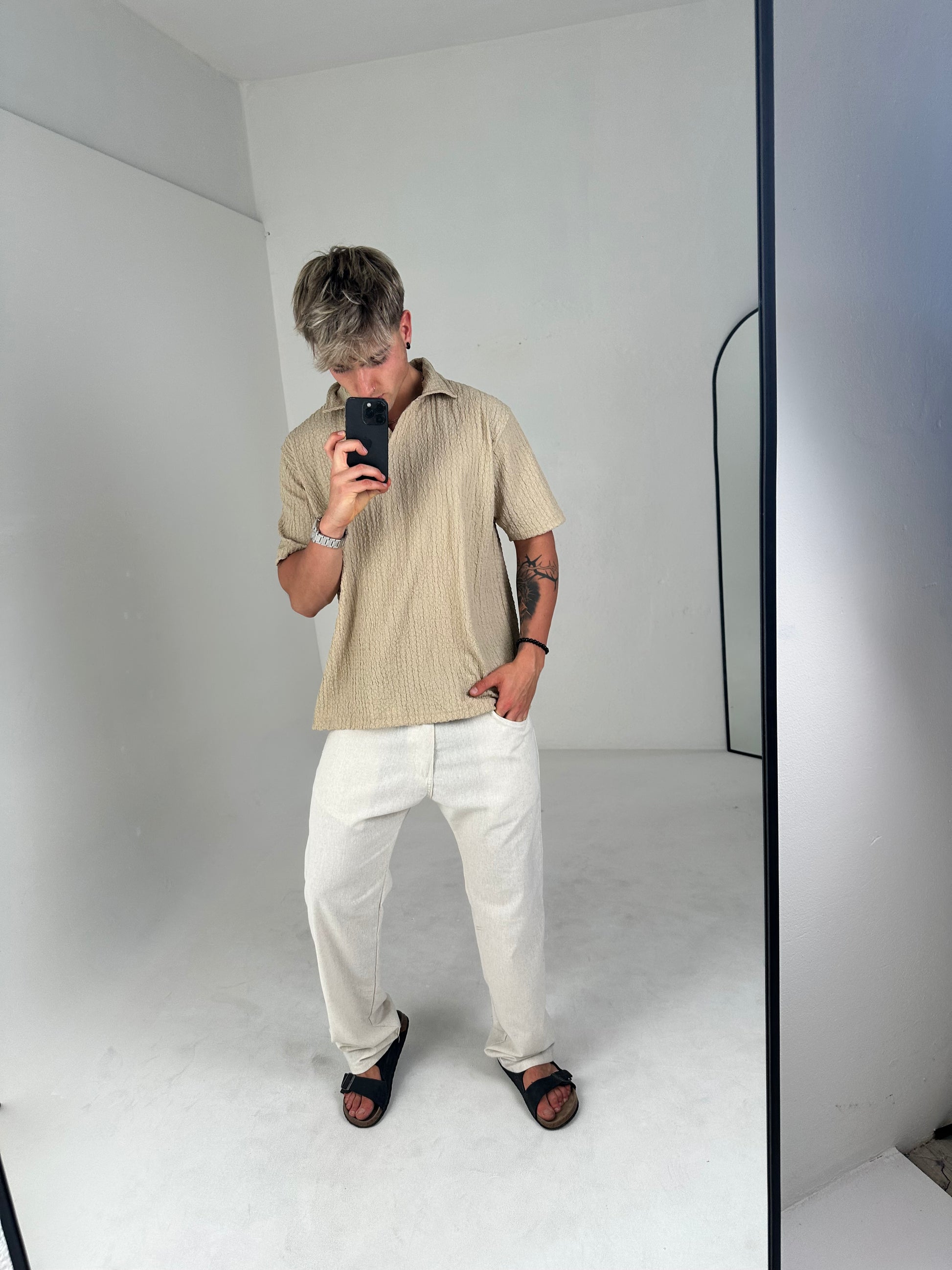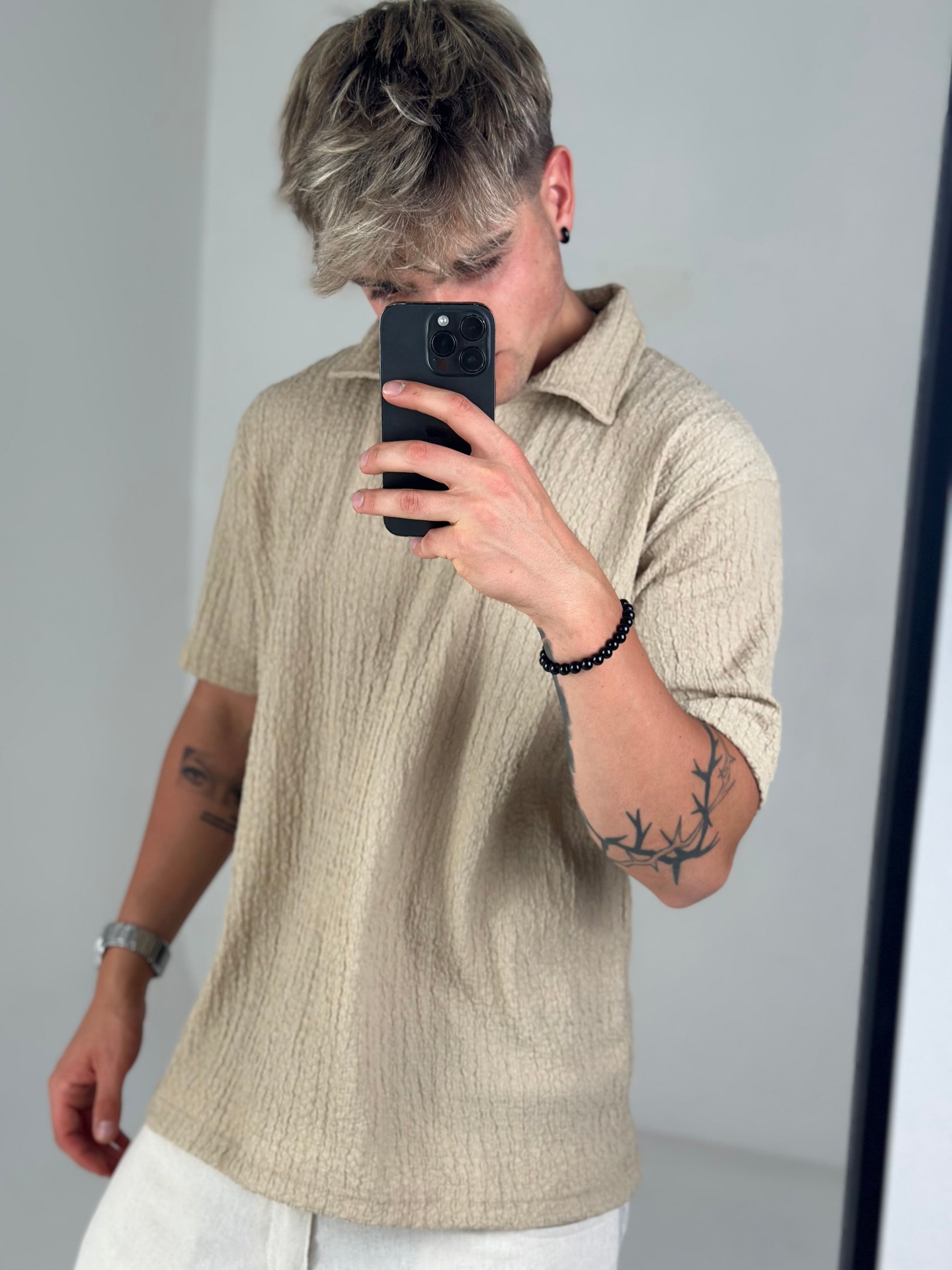La chomba beige en tela jacquard es perfecta para quienes buscan un look fresco, limpio y veraniego.