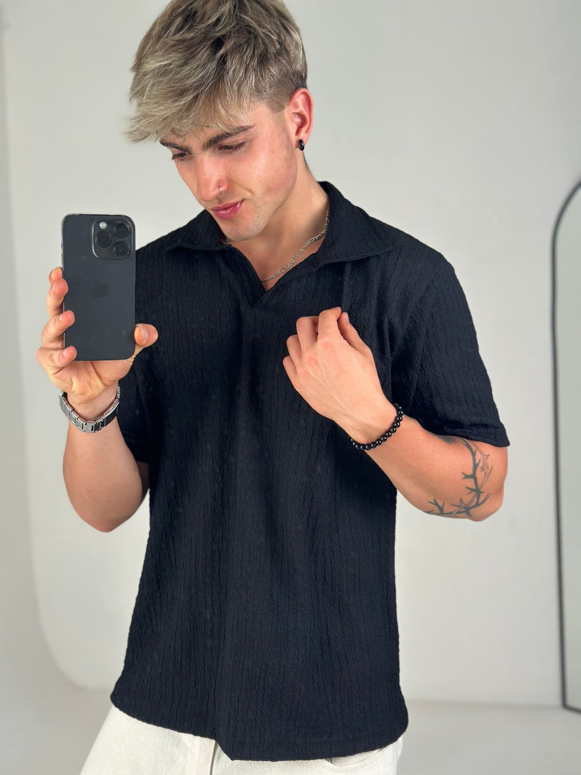 Si buscás una prenda simple pero con presencia, esta chomba negra siempre funciona.