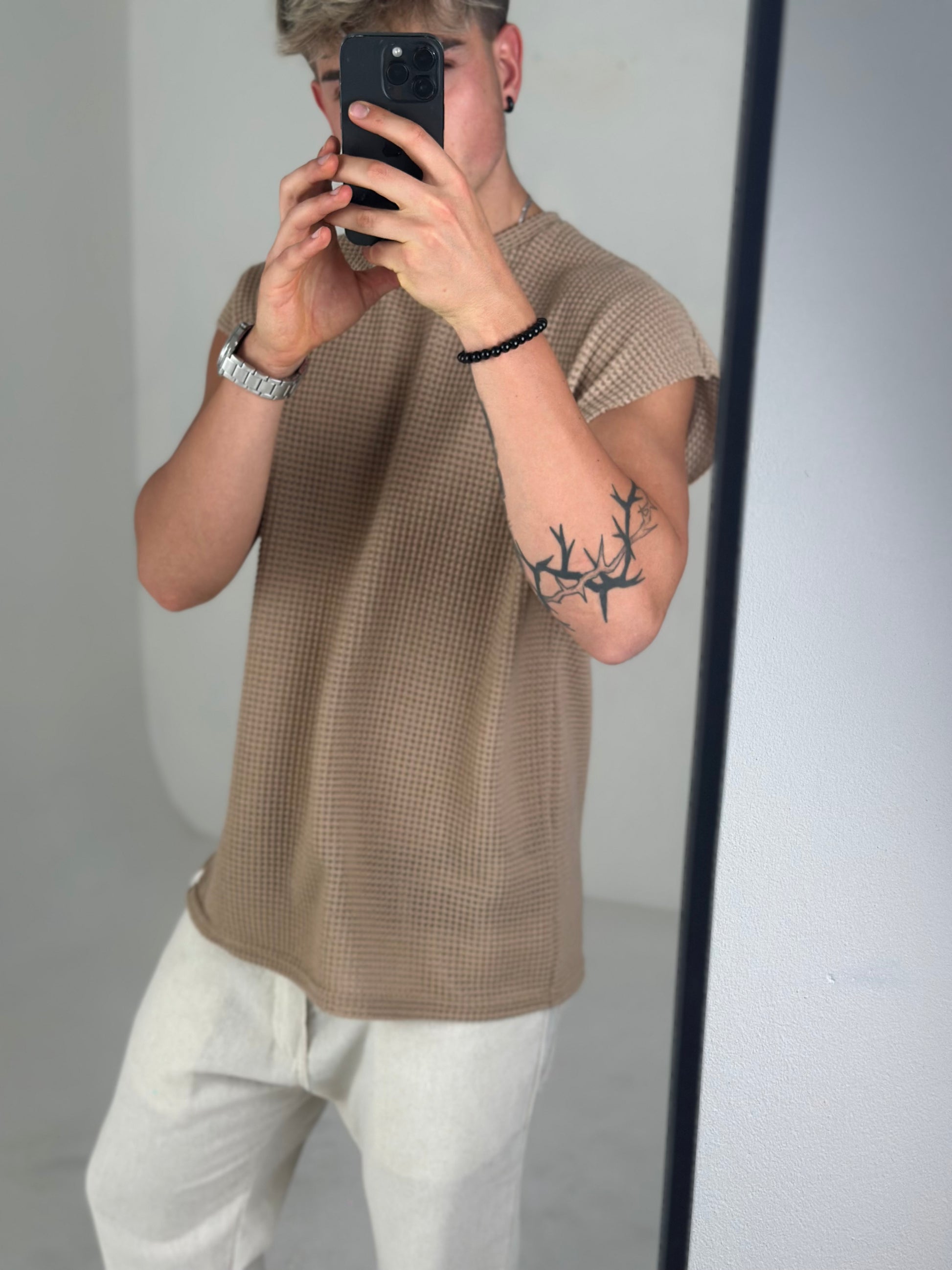 La musculosa oversize beige en tela tejida es una prenda clave para looks frescos y relajados.