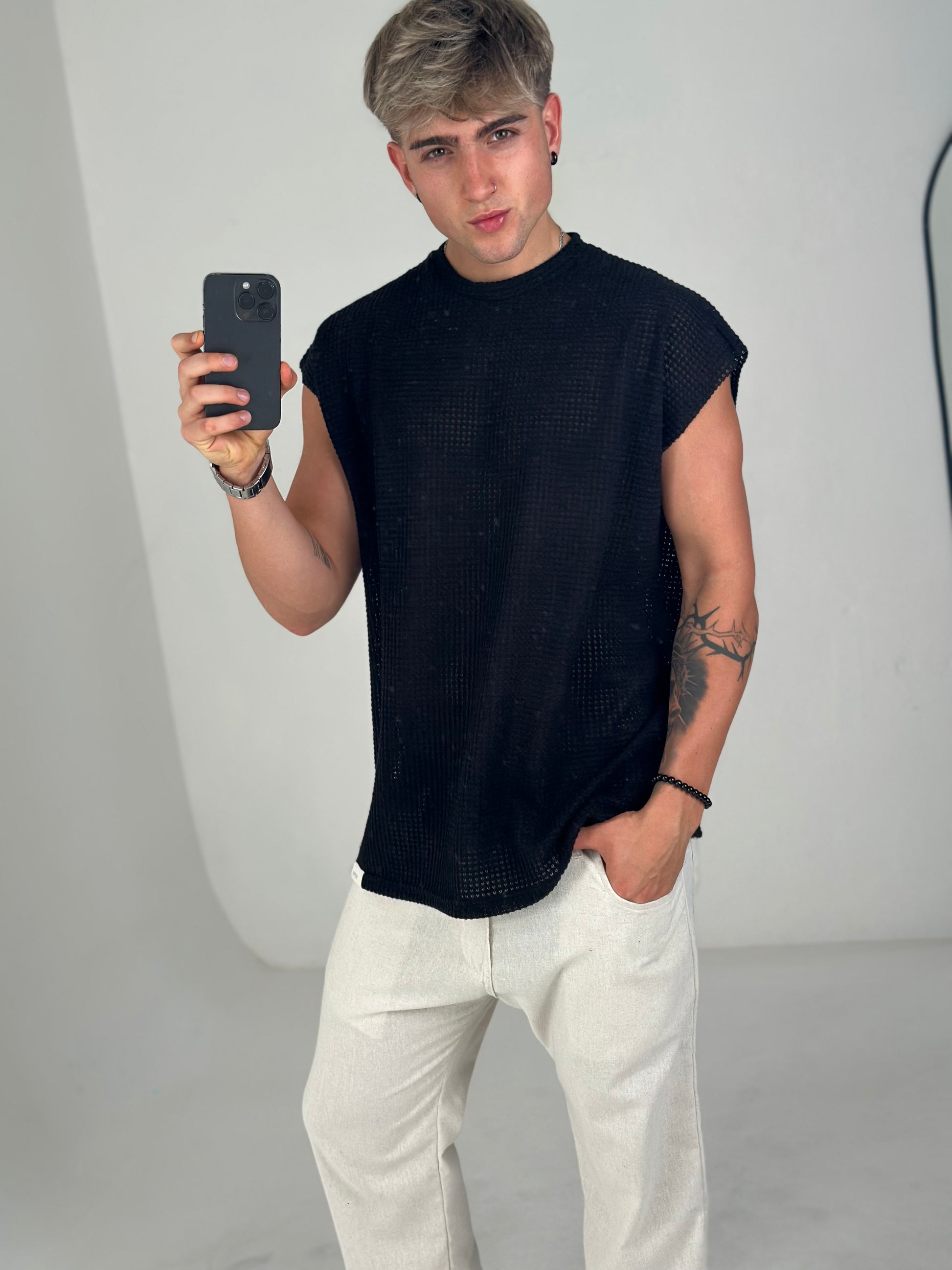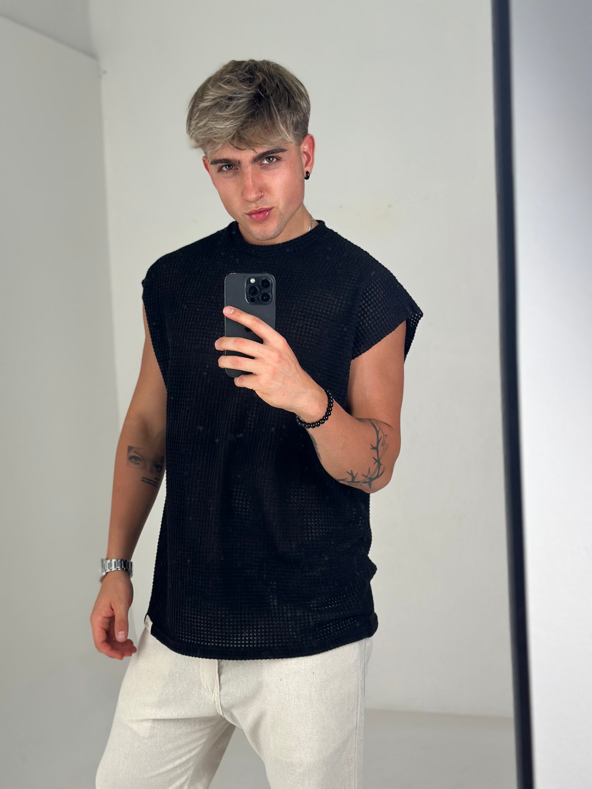 La musculosa oversize negra en tela tejida es ideal para los días de calor donde querés estar cómodo, fresco y con estilo.